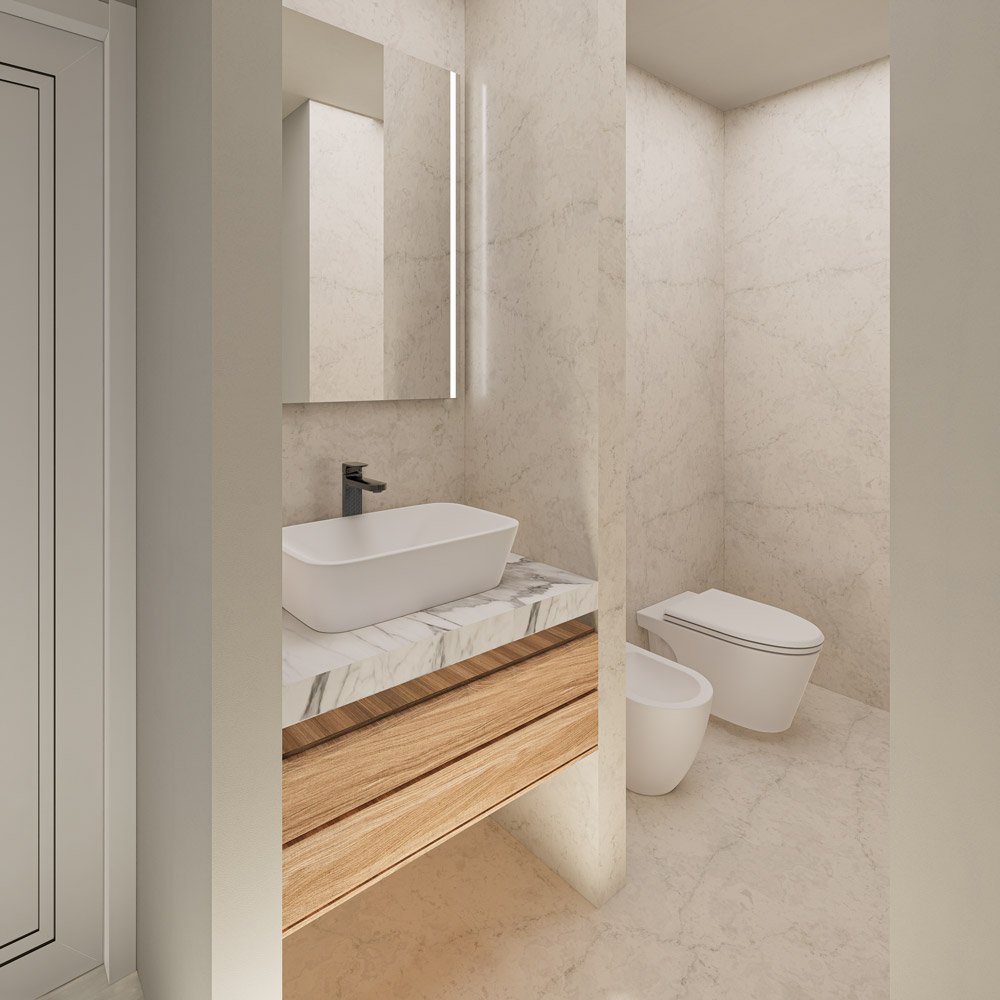 Tanque de 500 lts en espacio técnico, cañerías de agua por termofusión y desagües en polipropileno. Incluye termotanque eléctrico y bomba presurizadora.